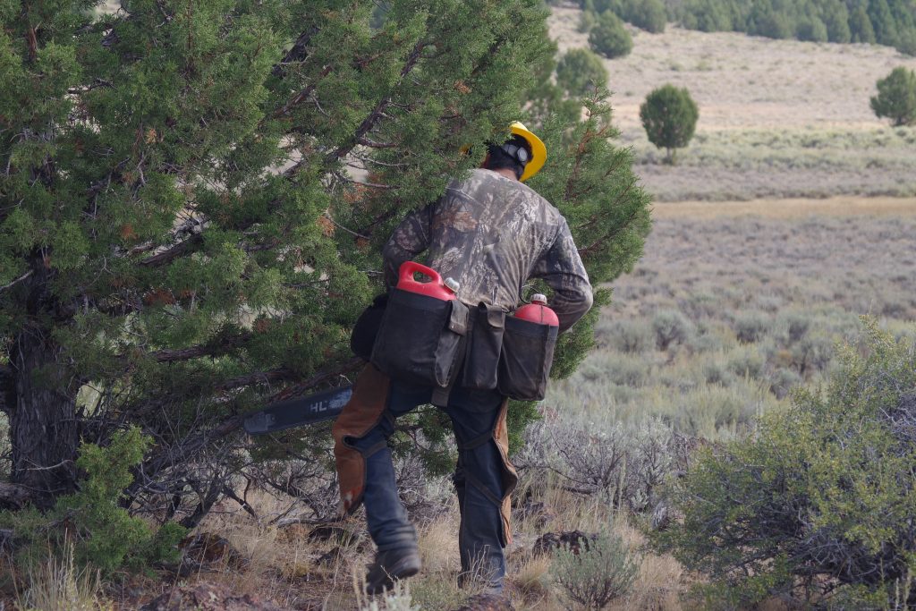 Hiking through the sagebrush, the crew drops juniper trees as they go.