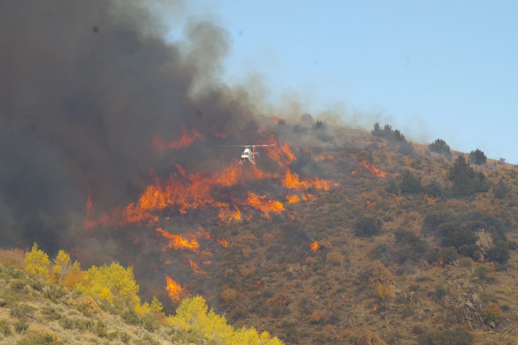 Juniper cutting projects added fuel to the landscape. The brownish-blond dead juniper needles can be seen amid the sagebrush as the helicopter flies overhead.